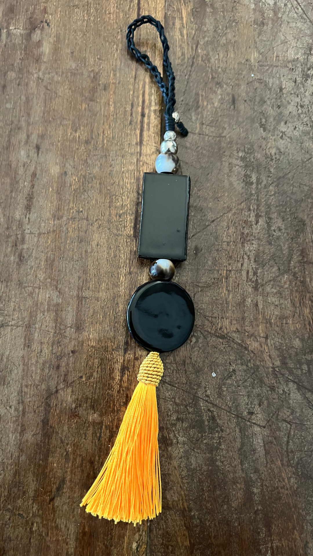 Materiais: Cerâmica, metais, fios de algodão encerado, pingente em fios de seda.