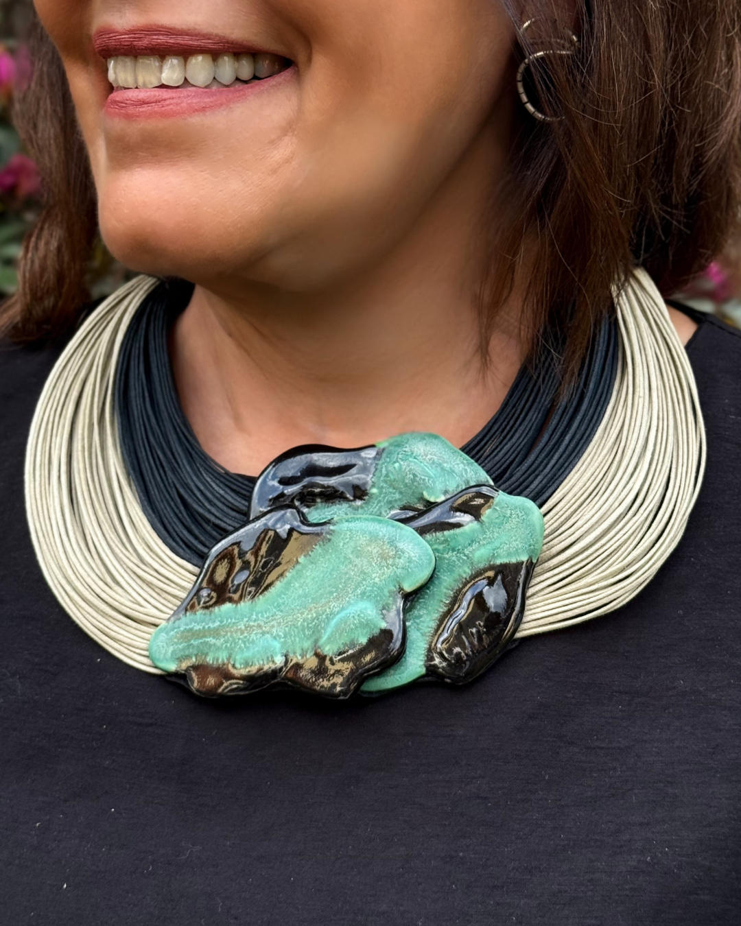 Materiais: Placas de cerâmica, fios de algodão encerados, acabamento em couro e fecho em cerâmica.