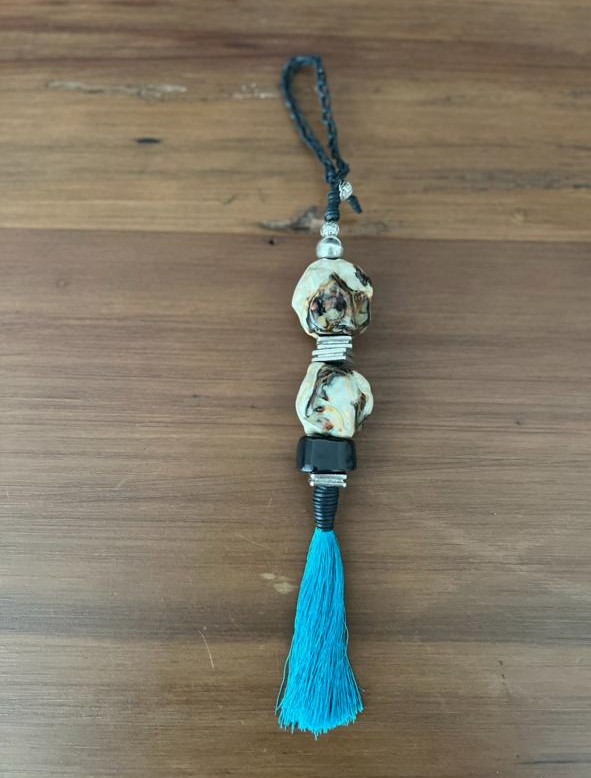 Materiais: Cerâmica, metais, fios de algodão encerado, pingente em fios de seda.