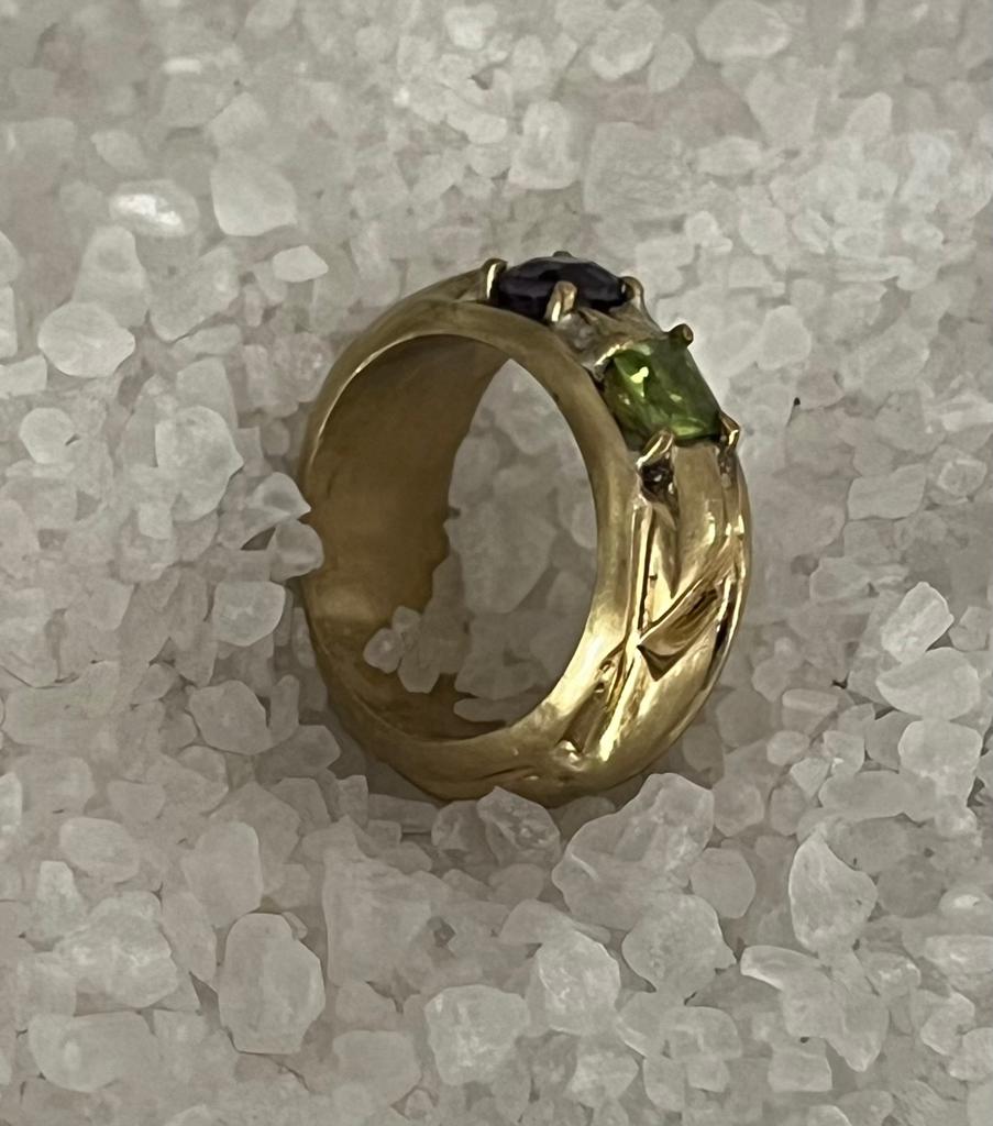 Materiais: Peça confeccionada em latão com uma camada de esmalte para evitar oxidação. Pedras: Ametista e Peridoto.
