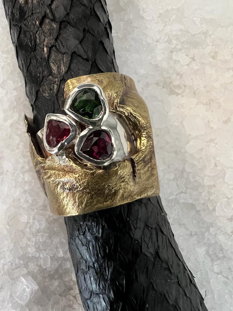 Materiais: Peça confeccionada em prata 950 e latão com camada de esmalte para evitar oxidação, pedras ametista e turmalina verde.