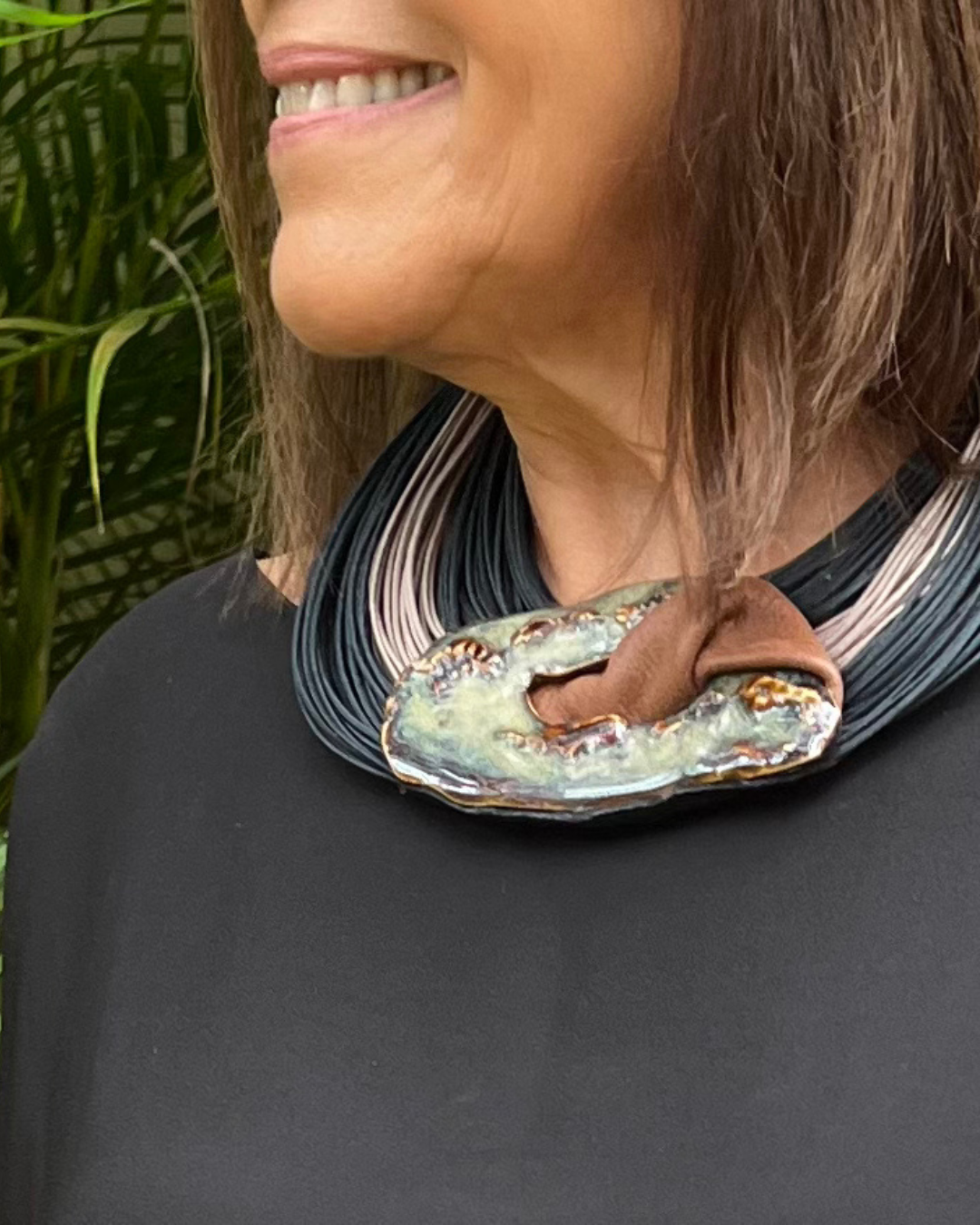 Diferenciais da peça: Concebida e confeccionada artesanalmente pela artista. Depois da queima, a cerâmica, moldada e pintada à mão, é harmonizada aos fios para receber o acabamento primoroso. Resultado: peça única e exclusiva.