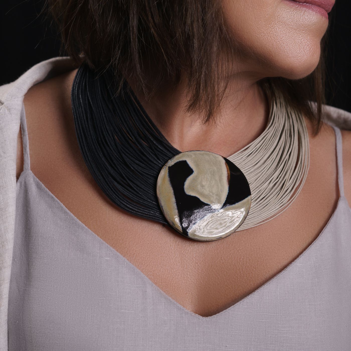 Materiais: Placas de cerâmica, fios de algodão encerados, acabamento em couro e fecho em cerâmica.