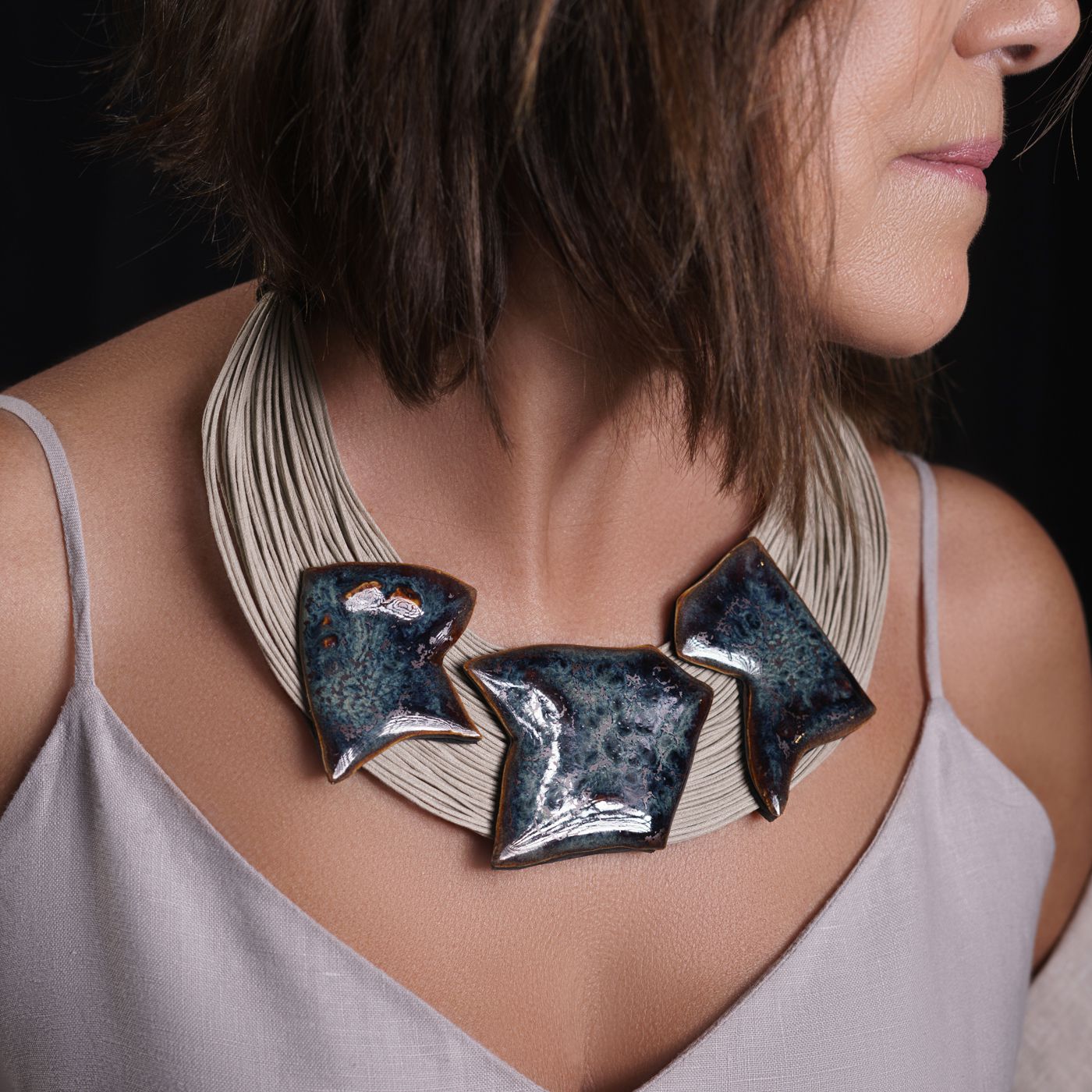 Materiais: Placas de cerâmica, fios de algodão encerados, detalhe em pele de salmão, acabamento em couro e fecho em cerâmica.
