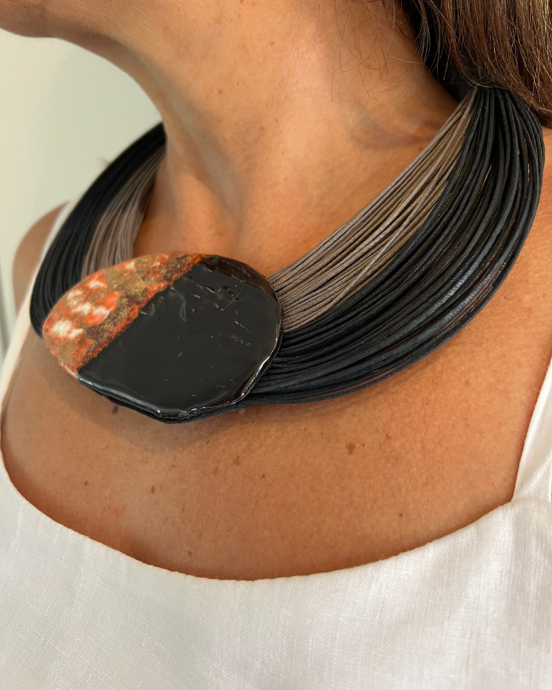 Materiais: Placa de cerâmica, fios de algodão encerados, acabamento em couro e fecho em cerâmica.