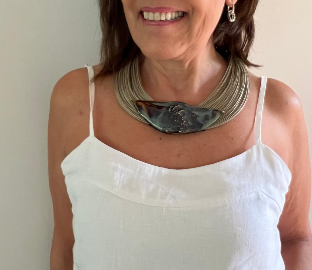 Diferenciais da peça: Concebida e confeccionada artesanalmente pela artista. Depois da queima, a cerâmica, moldada e pintada à mão, é harmonizada aos fios para receber o acabamento primoroso. Resultado: peça única e exclusiva.