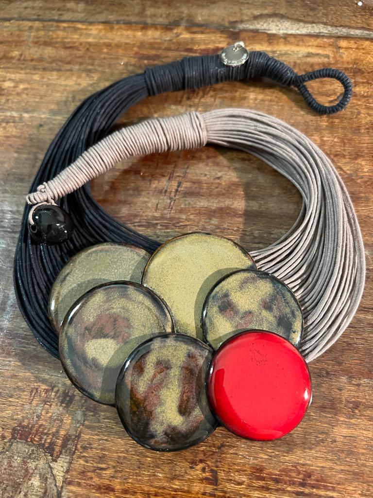 Materiais: Placas de cerâmica, fios de algodão encerados, acabamento em couro e fecho em cerâmica.