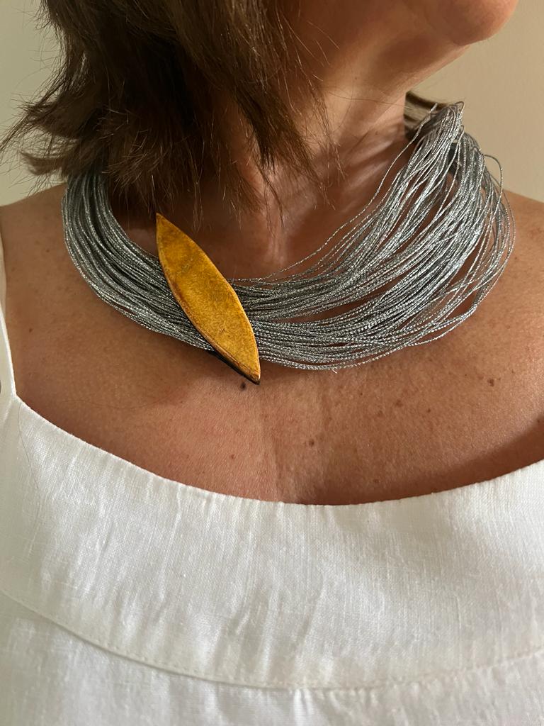Materiais: Placa em cerâmica,fios prateados metalizados e encorpados,acabamento em couro por trás da cerâmica, e fecho em cerâmica.