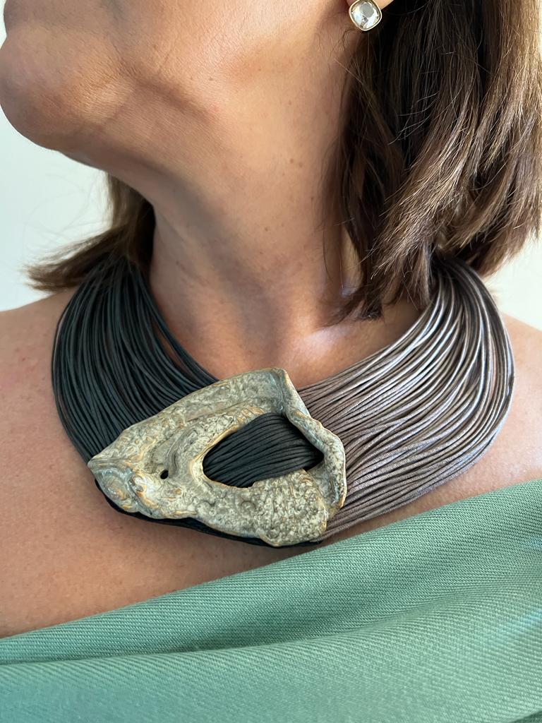 Materiais: Placa em cerâmica, fios de algodão encerados, acabamento em couro e fecho em cerâmica.
