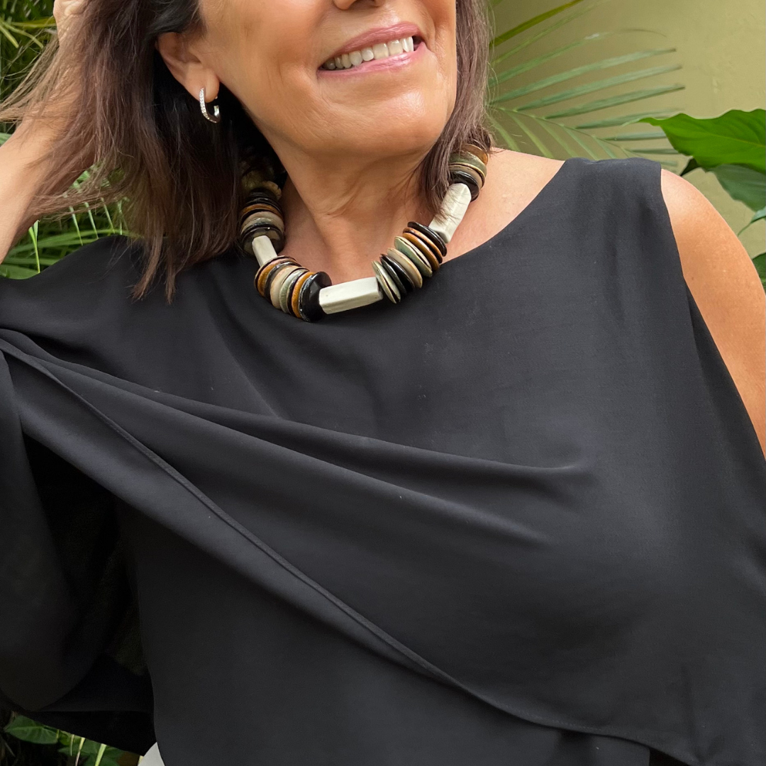 A coleção de colares em cerâmica é uma experiência multicultural de Rosaly Rezende, designer de acessórios femininos e peças decorativas. O resultado do olhar aguçado da artista que absorve a ousadia das ruas ao redor do mundo para imprimir em suas peças uma explosão de cores e formas. Materiais não nobres são trabalhados e combinados com sofisticação em peças artesanais e únicas. Força e personalidade definem a arte contemporânea de Rosaly Rezende. Permita-se!