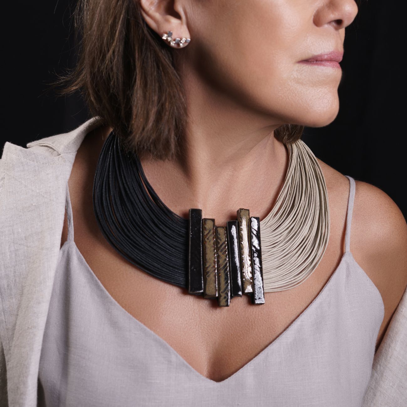 A coleção de colares em cerâmica é uma experiência multicultural de Rosaly Rezende, designer de acessórios femininos e peças decorativas. O resultado do olhar aguçado da artista que absorve a ousadia das ruas ao redor do mundo para imprimir em suas peças uma explosão de cores e formas. Materiais não nobres são trabalhados e combinados com sofisticação em peças artesanais e únicas. Força e personalidade definem a arte contemporânea de Rosaly Rezende. Permita-se!