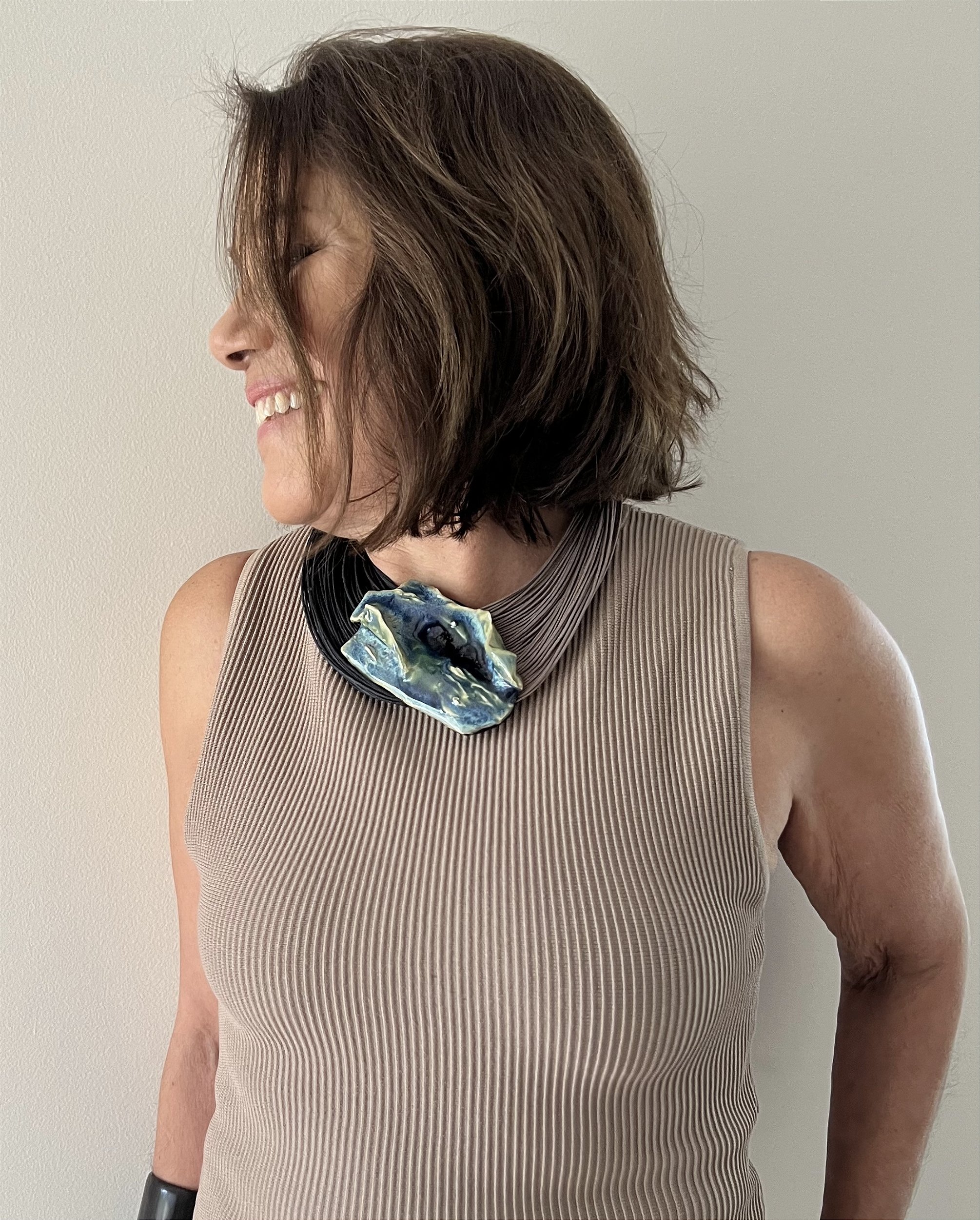 Diferenciais da peça: Concebida e confeccionada artesanalmente pela artista. Depois da queima, a cerâmica, moldada e pintada à mão, é harmonizada aos fios para receber o acabamento primoroso. Resultado: peça única e exclusiva.