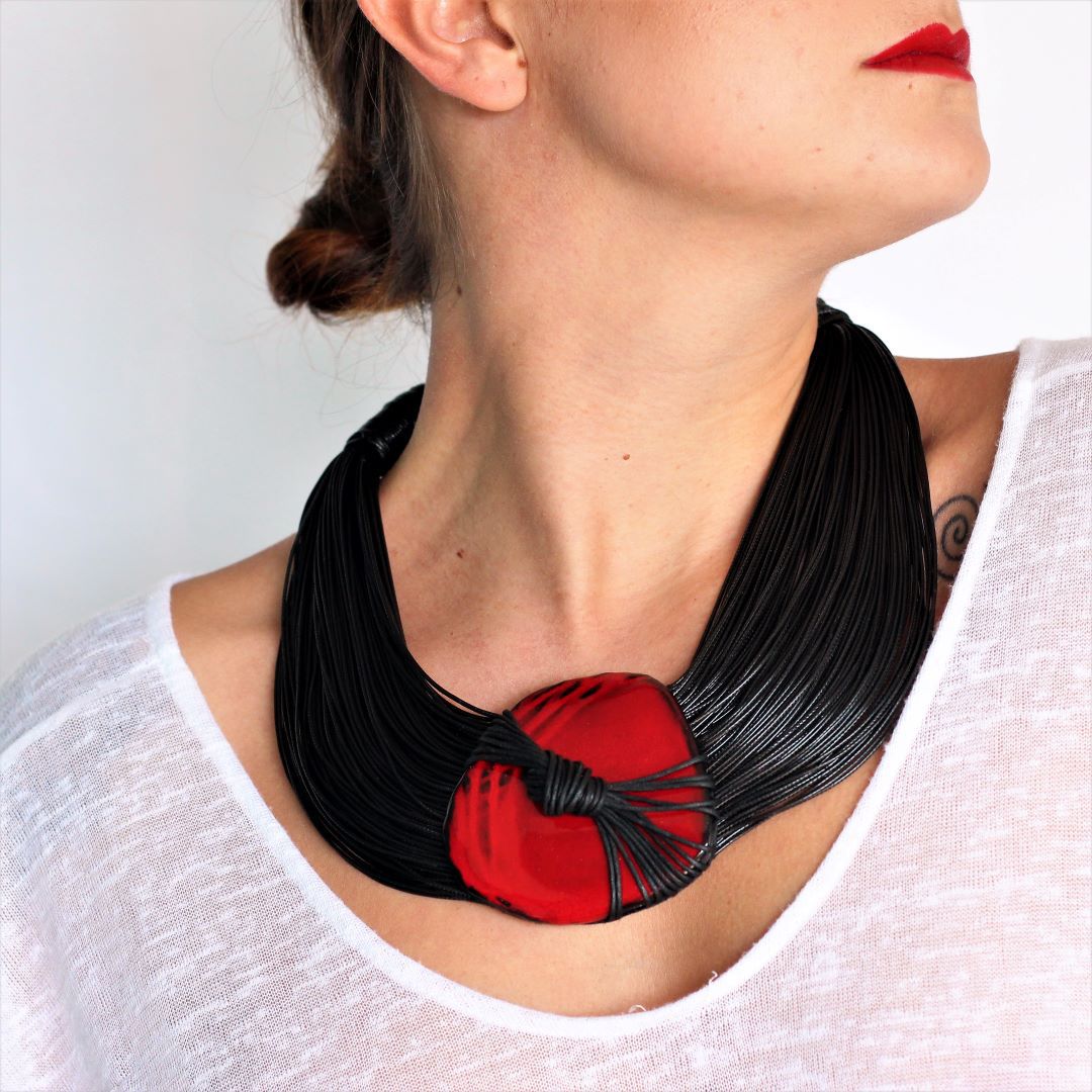Materiais: Placa de cerâmica, fios de seda, acabamento em couro e fecho em resina.