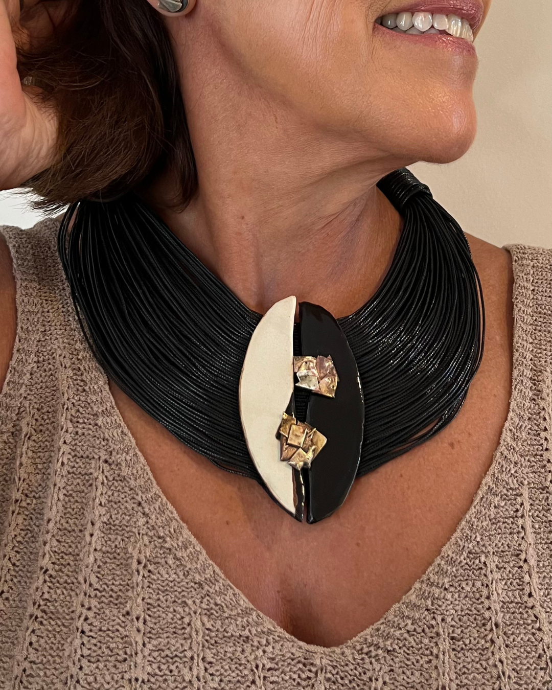 Materiais: Placas de cerâmica com metais adornando as peças, fios de algodão com seda, acabamento em couro, fecho em cerâmica.