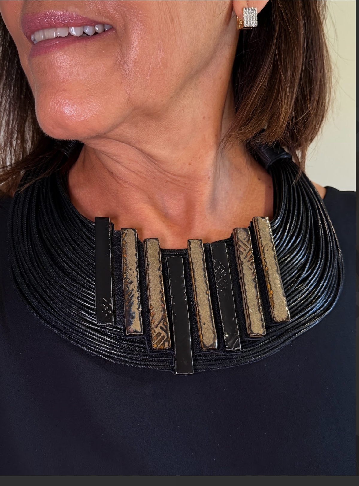 Materiais: Placas de cerâmica, couro, fios de seda com algodão, fecho em cerâmica.