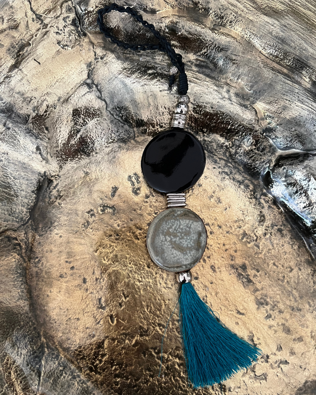 Materiais: Cerâmica, metais, fios de algodão encerado, pingente em fios de seda.