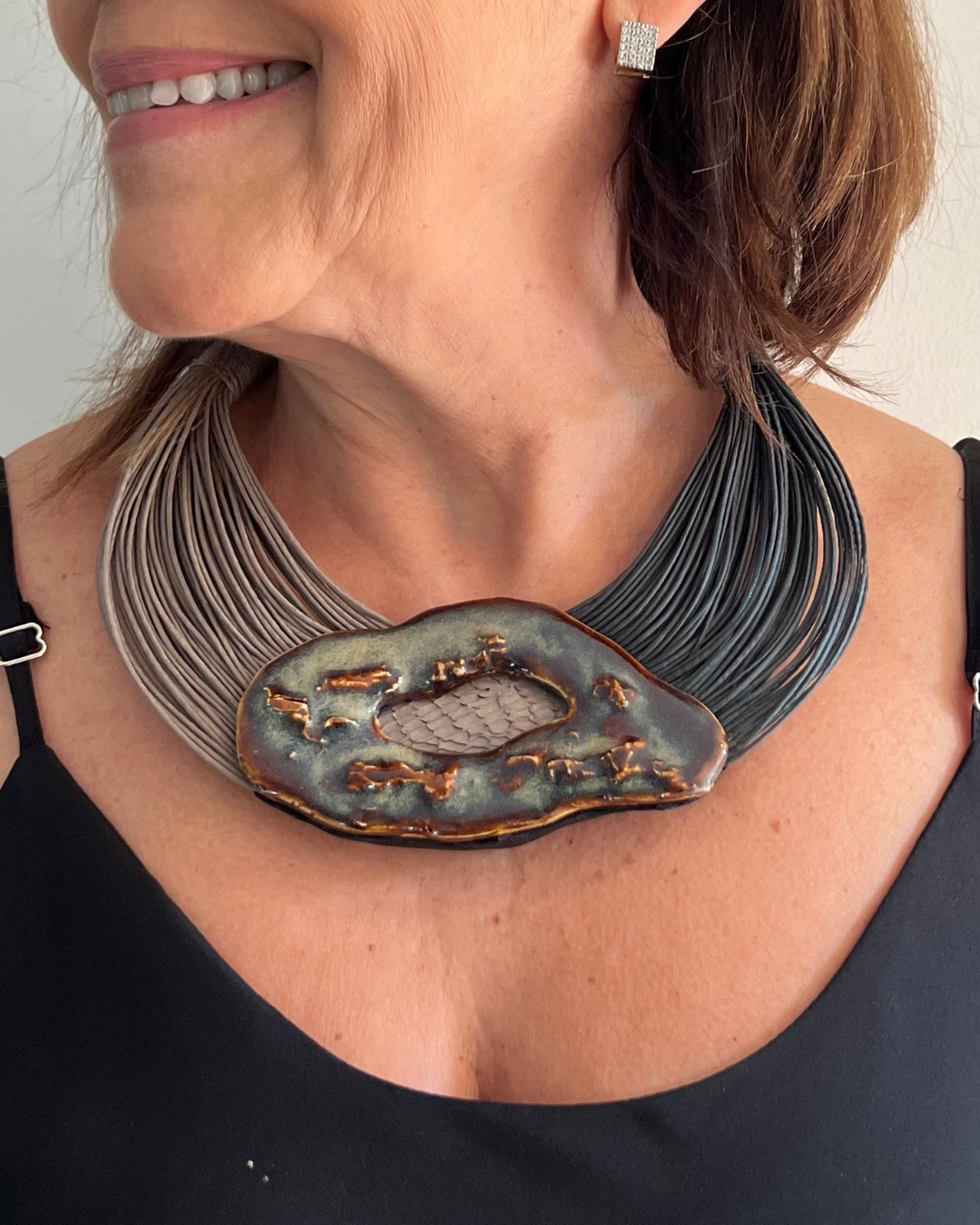 Materiais: Placa de cerâmica, pele de salmão, fios de algodão encerados, acabamento em couro e fecho em cerâmica.